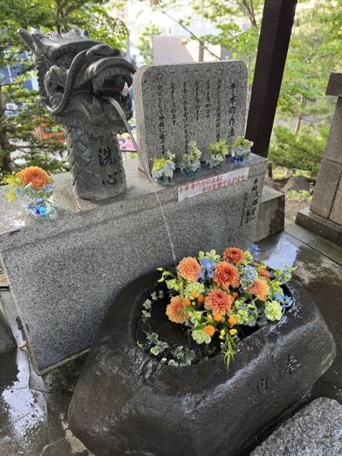 春の花詣、夏越大祓に続いて今年3度目の花手水奉納で花と色彩の癒しをお届けすべく努めさせていただきます。